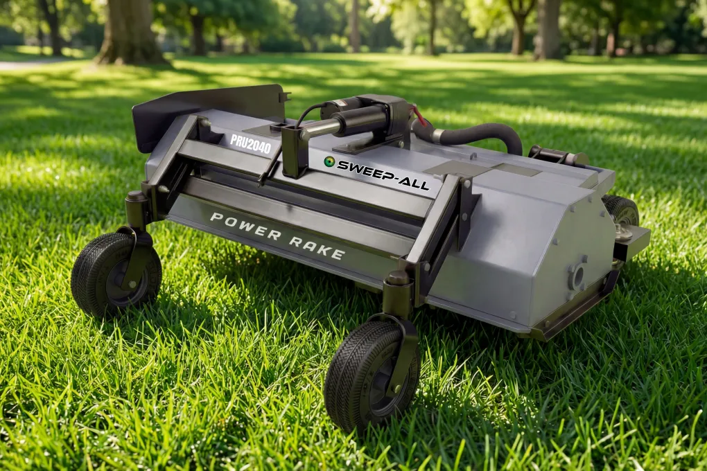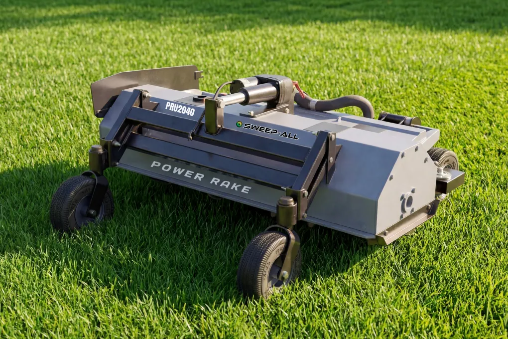 – PRU2040 PTO-driven power rake attachment with 37.5″ raking width and 108 steel tines for aggressive, consistent dethatching.